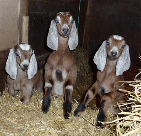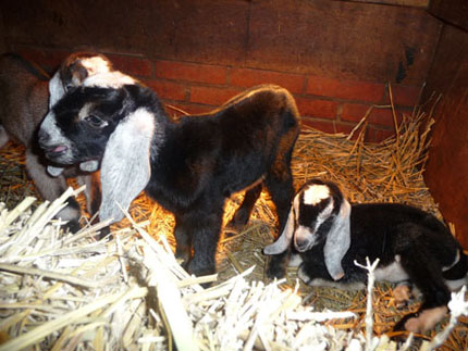 American Queen, dochter van KI-bok Goldthwaite Prince Valiant heeft drie boklammeren gebracht ook verwekt via KI met Goldthwaite Black Tie Affair. Dat betekent dat dit de eerste 75% Amerikaans Nubische dieren zijn in Europa. Ze zijn lijngeteelt op de Goldthwaitedieren uit Amerika welke via de "Links" ook te vinden zijn. Moeder Queen was een maand geleden erg ziek en ze heeft ruim twee weken bijna geen eten gehad, gelukkig heeft ze de lammeren in leven weten te houden maar ze hebben hierdoor zeker een groei achterstand gekregen. Dat is duidelijk te zien aan het haar wat nog erg kort en prematuur is, tevens zijn ze nog niet zo zwaar maar ze drinken goed en zijn gezond. Queen is inmiddels weer aan de beterende hand maar heeft de afgelopen weken veel energie uit haar reserve's gehaald waardoor ze veel spiermassa en dus gewicht is verloren. Zoals te zien op de foto's zijn twee van de drie bijzonder gekleurd met een zwarte alpine aftekening waarbij een boklam dezelfde aftekening heeft als vader Black Tie Affair en een ander dezelfde aftekening als grootvader Prince Valiant. Het derde boklam is bruin, alledrie hebben ze sneeuwitte oren.