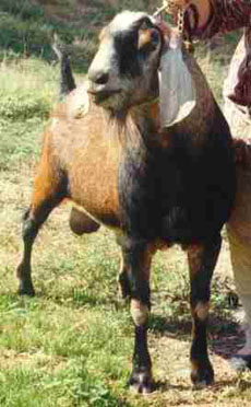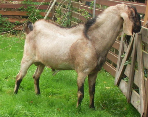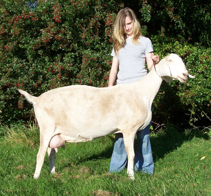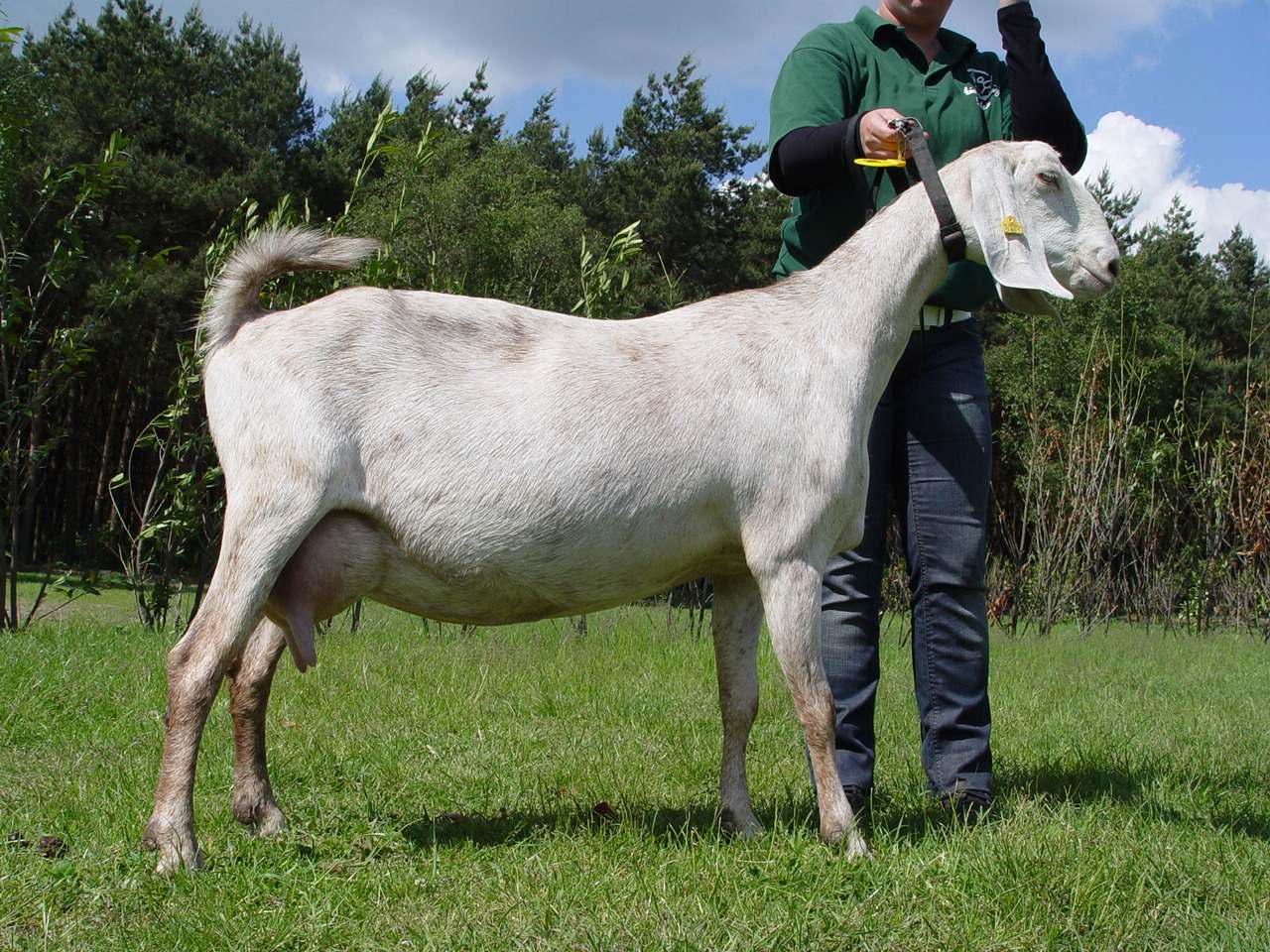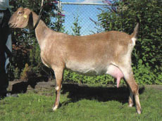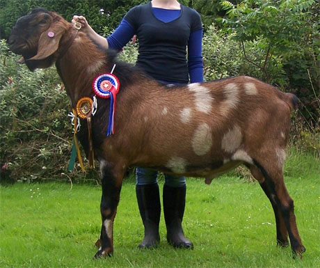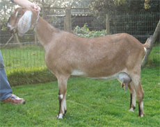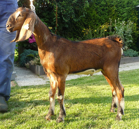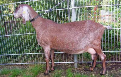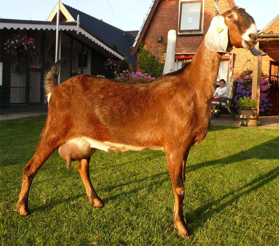 Athene Gold v Oudwoude KI (Black Tie Affair x Afrodite) als 1-jarige, ingeschreven met AV86 en 88 uier. Moeder van Fangio en ge-exporteerd naar Duitsland naar Elite Anglo Nubier ziegen (zie links).