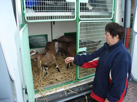 Op 12 februari hebben Chris Nye en Hilary Mathews uit Engeland een bezoek aan ons gebracht met als doel een boklam en geitlam met Amerikaanse genen te kopen. Het zijn uiteindelijk een boklam en twee geitlammeren geworden die op 26 februari door het dierentransportbedrijf Animal Couriers Ltd. (zie links) van Julia Baber via Zweden zijn opgehaald. Het KI-boklam Gentle Giant van de gestorven Afrodite en de twee zusjes Alanis en Averil verblijven inmiddels in Engeland waar zij de Amerikaanse genen verder zullen verspreiden. Wij wensen Chris Nye veel succes met zijn nieuwe aanwinsten.