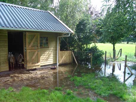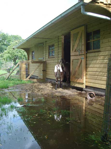 In de middag van 4 juli heeft een enorme wolkbreuk boven Buitenpost voor een gigantische neerslag gezorgd. Dit resulteerde onder andere in een groot waterballet voor de geiten. Ze zien natte voeten echter niet zitten! Hierdoor helaas geen vers gras vandaag.