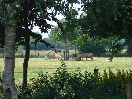 Na het hooien begin juni staat er weer erwtgroen en dat lusten ze maar al te graag. Ondertussen genieten van de schaduw van de kastanjeboom midden op het land.