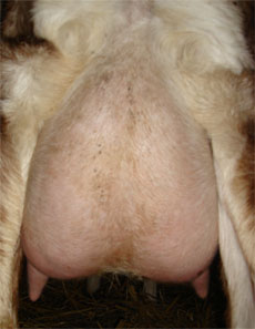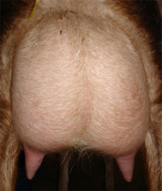 Uier Lucky Lady een dag na aflammeren met slechts 6 uur melk in het uier